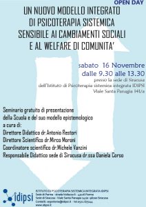 Seminario gratuito di presentazione della Scuola e del suo modello epistemologico: <<UN NUOVO MODELLO INTEGRATO DI PSICOTERAPIA SISTEMICA SENSIBILE AI CAMBIAMENTI SOCIALI E AL WELFARE DI COMUNITA'>>. A cura di Antonio Restori (Direttore Didattico), Mirco Moroni (Direttore Scientifico), Michele Vanzini (Coordinatore Scientifico), Daniela Corso (Responsabile Didattico della Sede di Siracusa). Programma open day novembre […]