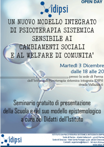 Seminario gratuito della Scuola e del suo modello epistemologico a cura dei Didatti dell'Istituto: <<UN NUOVO MODELLO INTEGRATO DI PSICOTERAPIA SISTEMICA SENSIBILE AI CAMBIAMENTI SOCIALI E AL WELFARE DI COMUNITA'>>. Programma open day Parma dicembre 2019