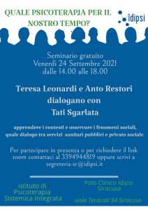 Ulteriori informazioni »Per il ciclo di seminari "Quale Psicoterapia per il nostro Tempo?" Teresa Leonardi e Antonio Restori dialogano con Tati Sgarlata. Seminario gratuito, in presenza e online. Per partecipare Tel. 339 4944819 Mail segreteria-sr@idipsi.it