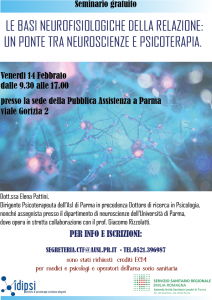 Seminario Le basi neurofisiologiche della relazione: un ponte tra neuroscienze e psicoterapia 14 Febbraio 2020 Sede conferenza Auditorium Assistenza Pubblica – V.le Gorizia 2/a Parma Relatori Dott Mirco Moroni - Dott.Antonio Restori - Dott.ssa Antonella Squarcia - Dott.ssa Elena Pattini Programma e scheda iscrizione